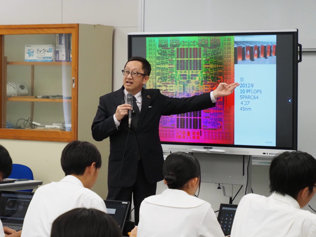 2025年10月14日(火)、熊本県立水俣高等学校にて『半導体を学ぼう』をテーマに黒田理事長が講演を行いました。講演では、スマホやゲーム機、AI(人工知能)など、身近なテクノロジーに欠かせない「半導体チップ」について、どんなふうに作られて、今後どのようになっていくかなどを解説しました。
