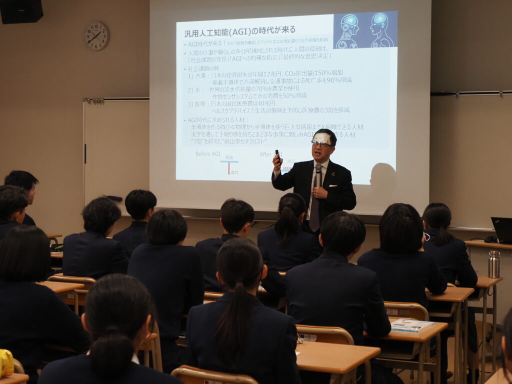 2025年11月20日(木)、熊本学園大学付属高等学校にて黒田理事長が講演を行いました。講演では、スマホやゲーム機、AI(人工知能)など、身近なテクノロジーに欠かせない「半導体チップ」について、どんなふうに作られて、今後どのようになっていくかなどを解説し、本学の新学部設置に向けた取組についても紹介しました。