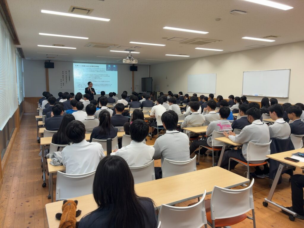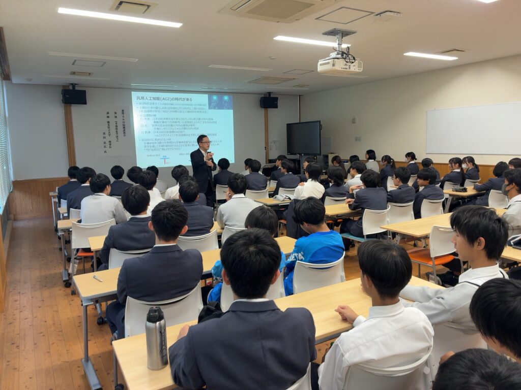 当日は理数科の1、2年生を中心に非常に多くの生徒さんにご参加いただきました。講演後には、「どうして半導体の構造は今の形になったのか。」「半導体の材料となるレアアースの国際的な問題はどのように解決するのか。」「AIは人間に反逆しないのか。」「生成AIは人間の未来も予想できるようになるのか。」など、質疑応答も活発に行われました。