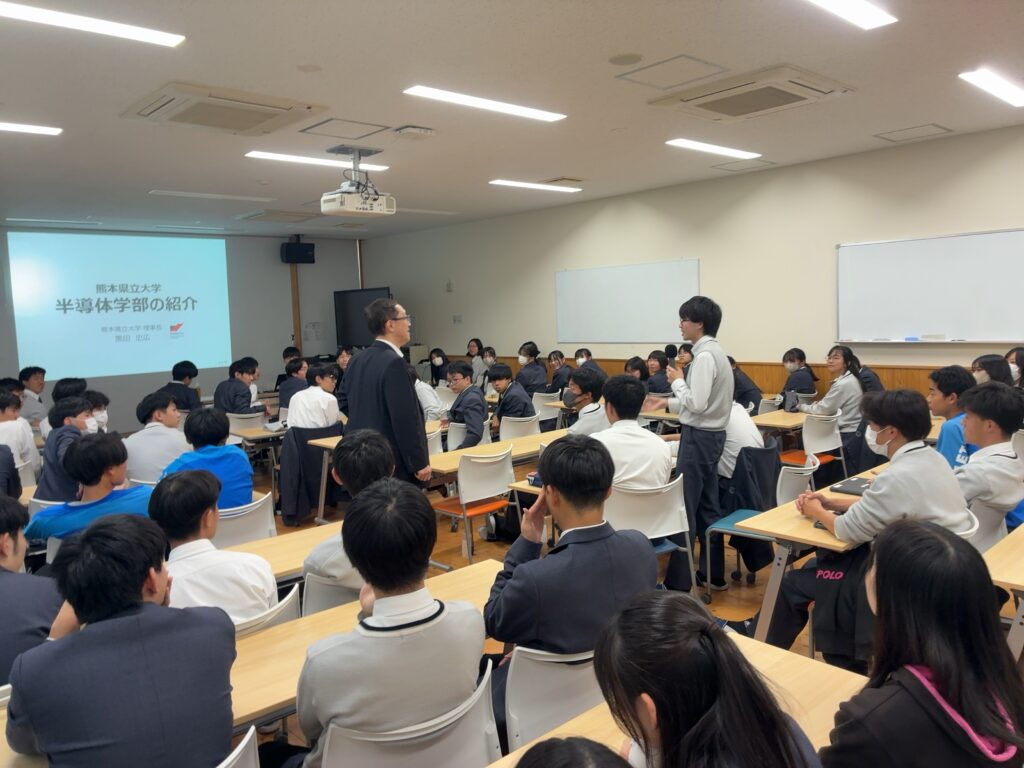 2025年11月28日(金)、熊本第二高等学校にて黒田理事長が講演を行いました。講演では、スマホやゲーム機、AI(人工知能)など、身近なテクノロジーに欠かせない「半導体チップ」について、どんなふうに作られて、今後どのようになっていくかなどを解説し、本学の新学部設置に向けた取組についても紹介しました。