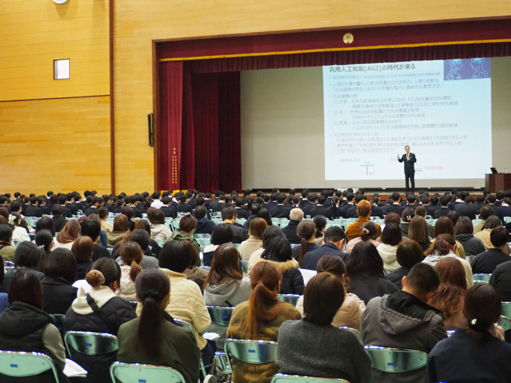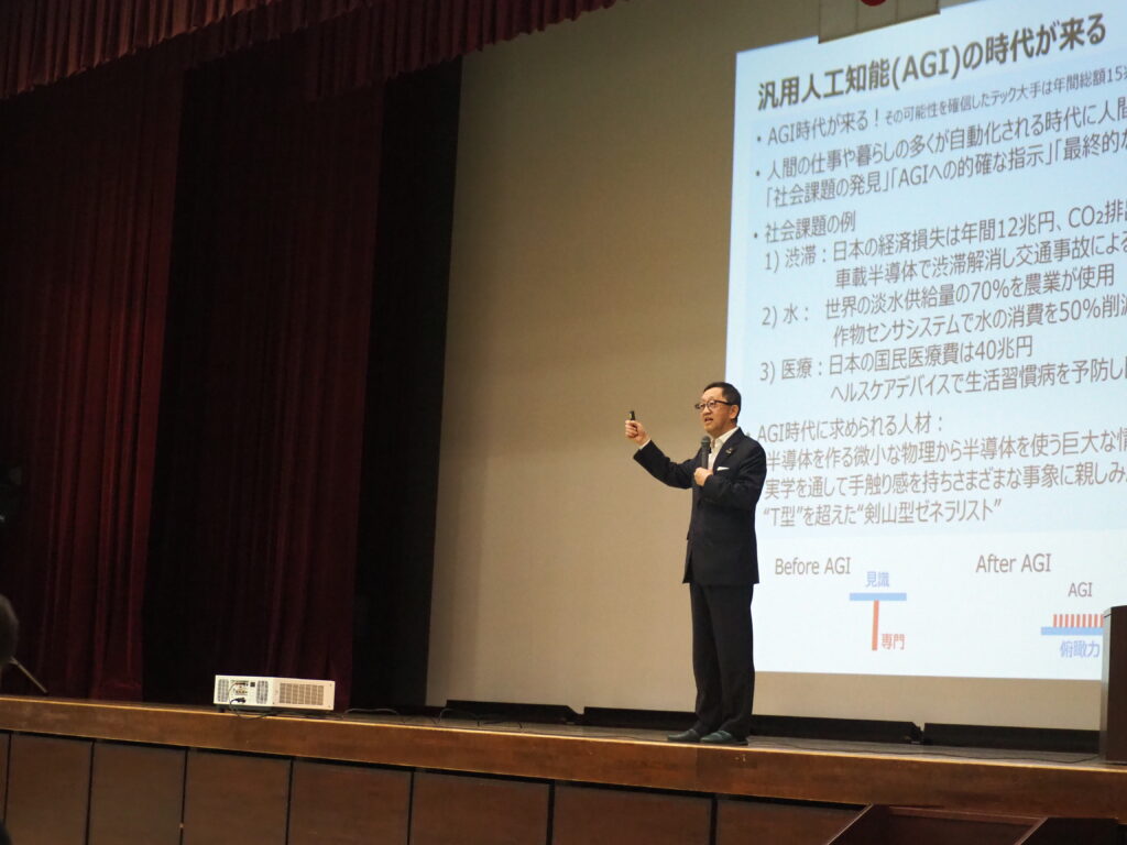 2025年11月29日(土)、文徳高等学校にて黒田理事長が講演を行いました。講演では、スマホやゲーム機、AI(人工知能)など、身近なテクノロジーに欠かせない「半導体チップ」について、どんなふうに作られて、今後どのようになっていくかなどを解説し、本学の新学部設置に向けた取組についても紹介しました。
