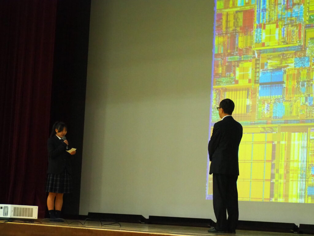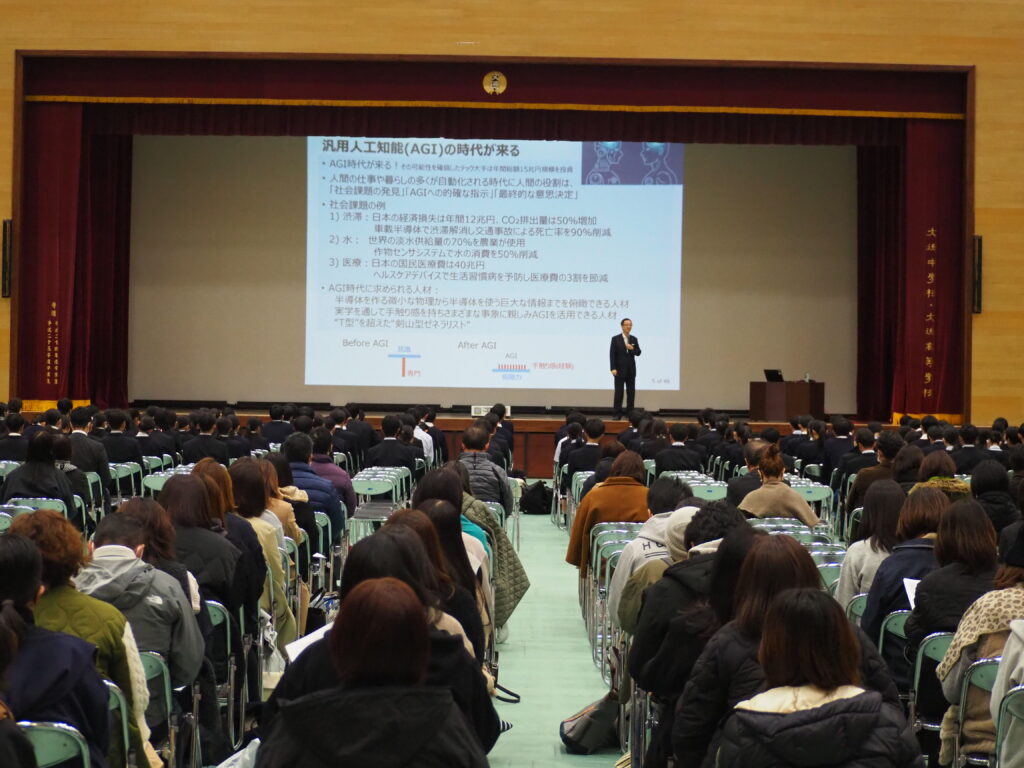 当日は保護者会のプログラムとして講演会を組み込んでいただき、1、2年生の生徒の皆さん、また保護者の皆様など、非常に多くの方々にご参加いただきました。講演後には、「半導体学部で学ぶ楽しさは。どんな人に半導体学部に入ってほしいか。」「どんな仕事がAIやロボットに取って代わられるのか。」「生成AIも人間の感情のようなものを表現できるようになるのか。」など、質疑応答も活発に行われました。